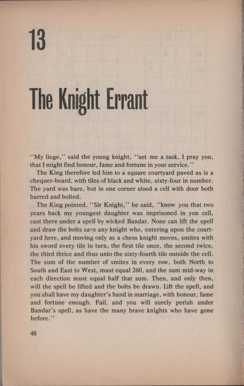 On page 48, there is a puzzle which combines a semimagic square (a square grid of numbers in which the numbers in each row and column are equal, but not the diagonals) with a knight's tour (a path taken by a chess knight which visits every square exactly once).